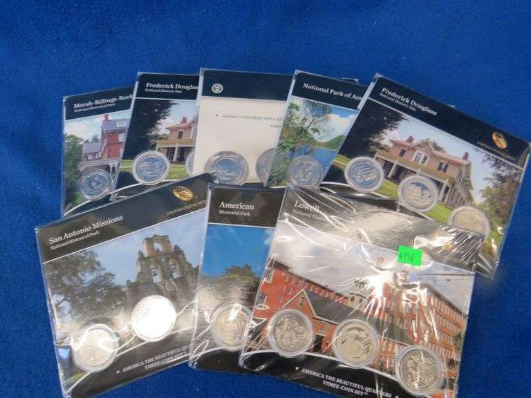 Eight US Mint America the Beautiful quarter sets. Each set contains three quarters.