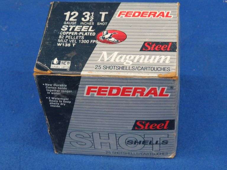 One box of 25 Federal 3 1/2" steel T-shot 12-gauge shotgun shells