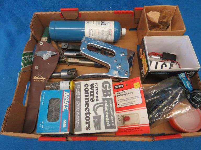 Mitutoyo micrometer, misc. hardware, stapler, and more