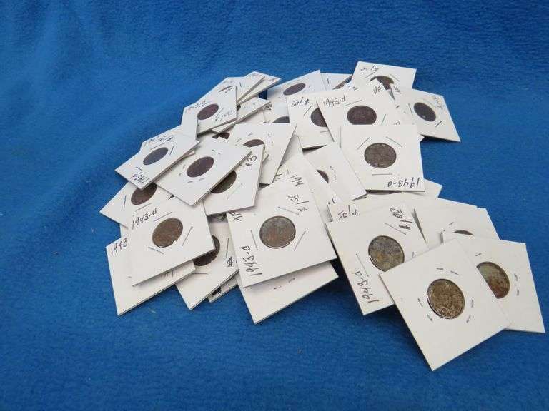 72 1943 steel wheat pennies. Includes pennies from all 3 mints. Most are showing rust.