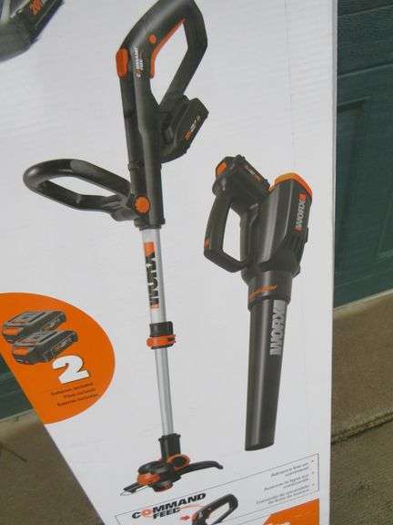 LOT 130 - NIB Worx 20-volt cordless blower and trimmer/edger. Includes two batteries and charger.