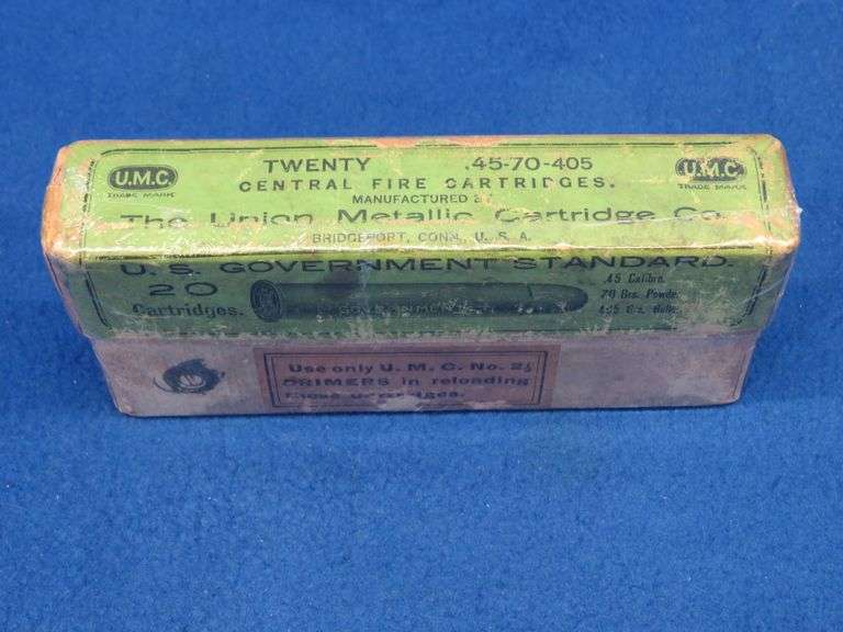20 vintage U.M.C. .45-70-405 rounds in a wrapped box that appears to be in very good condition