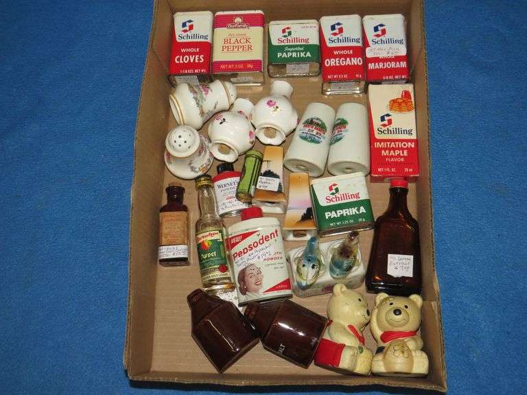 LOT 276 - Vintage tins, salt and peppers, and old bottles