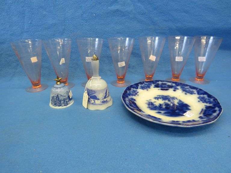 LOT 294 - Pink Depression era ice tea glasses, two bells, and a plate