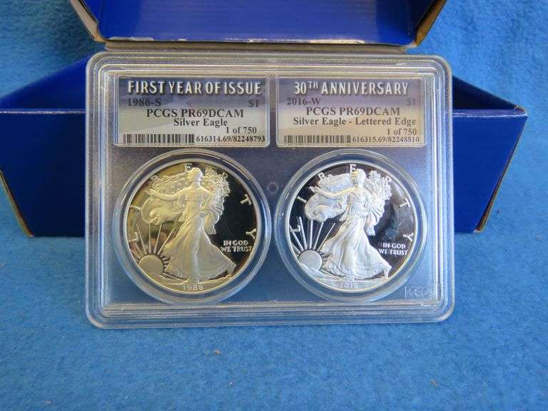 Two Silver Eagles. 1986-S and 2016 W. each have1 oz. fine silver and graded PCGS PR 69 DCAM