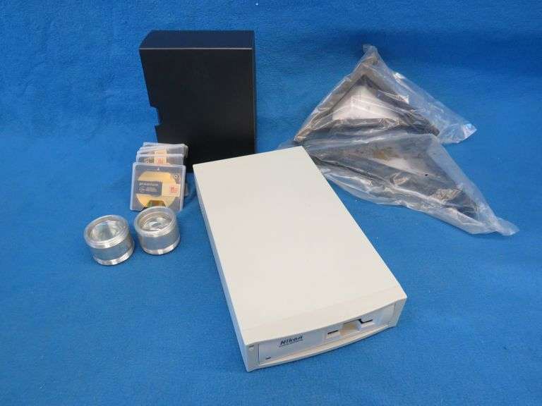 LOT 332 - Nikon Coolscan, Ikea brackets, Discgear storage box and lenses