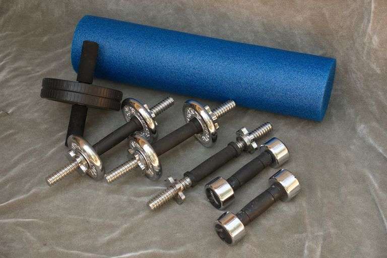 Two York dumbbells, each with two 2.5 pound weights and spin-lock collars. One dumbbell with spin-lock collars, but no weights. Two Reebok 5-pound dumbbells. Ab wheel. Foam roller.