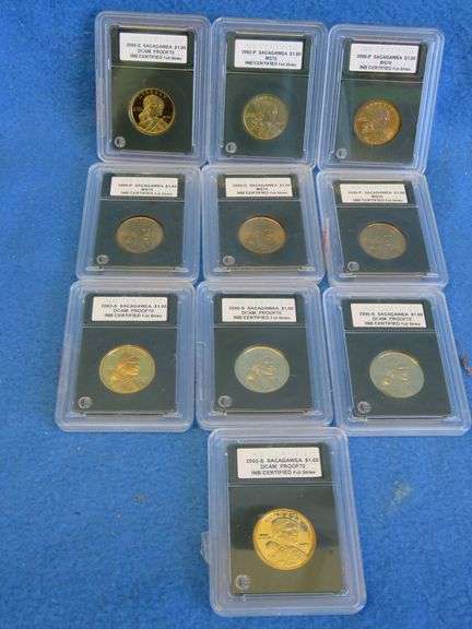Ten encapsulated Sacagawea one-dollar coins all INB certified as Full Strike