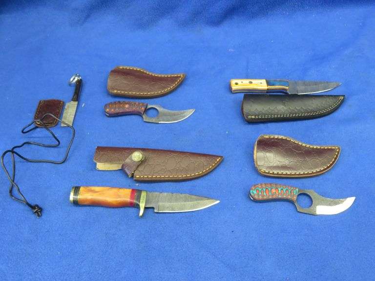 Five new knives. Four are Damascus and all five have leather sheaths.