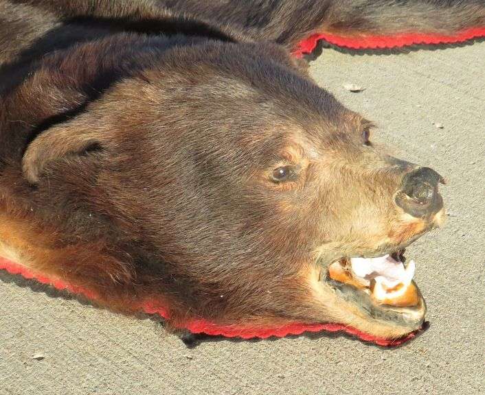 Bear skin rug in good condition. Approx. 65". Rear paws missing.