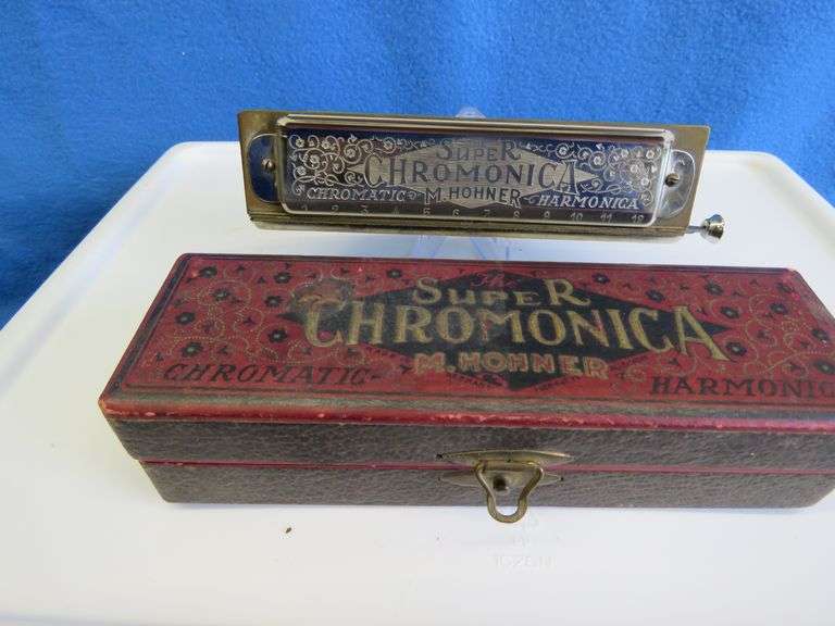 Hohner Chromonica 12-hole in the key of C with the hinged and clasped wooden box in excellent condition. Sounds great.