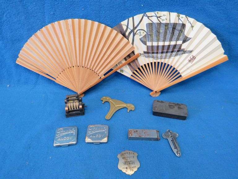 Collectible smalls including a Hennepin Co. badge, 2 Bambu Alcoy rolling paper tins, hand fans, and more