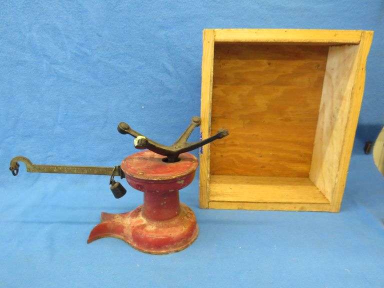 Antique Howe scale and a wooden shipping box