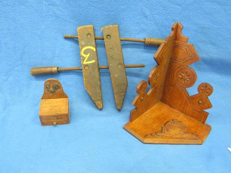 LOT 244 - Wooden clamp, toothpick holder, and a fancy corner shelf