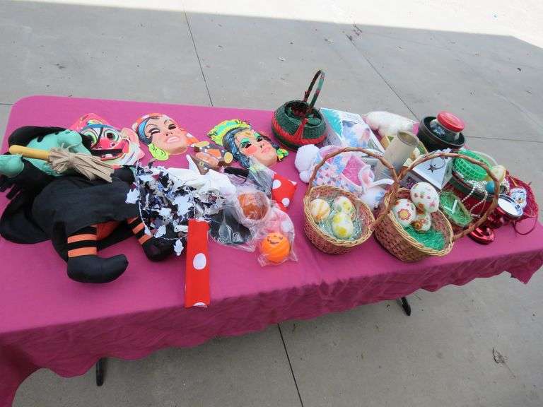 Easter and Halloween decorations including 3 vintage Halloween masks