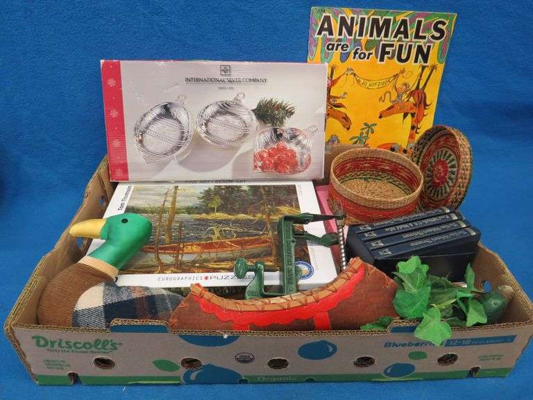 Misc. household items including an apple peeler, birch bark canoe, and more
