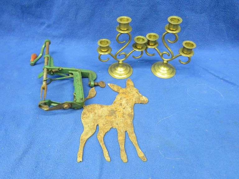 A pair of brass candle holders, vintage apple peeler, and a metal donkey