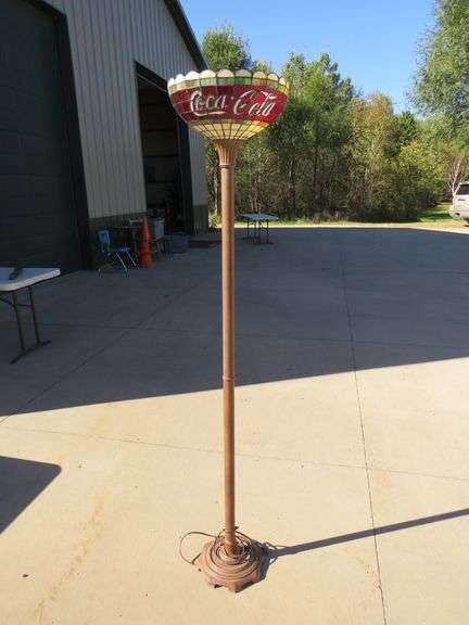 68" tall vintage metal floor lamp with a faux stained glass Coca-Cola shade